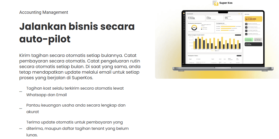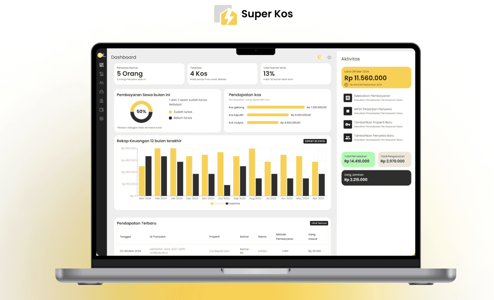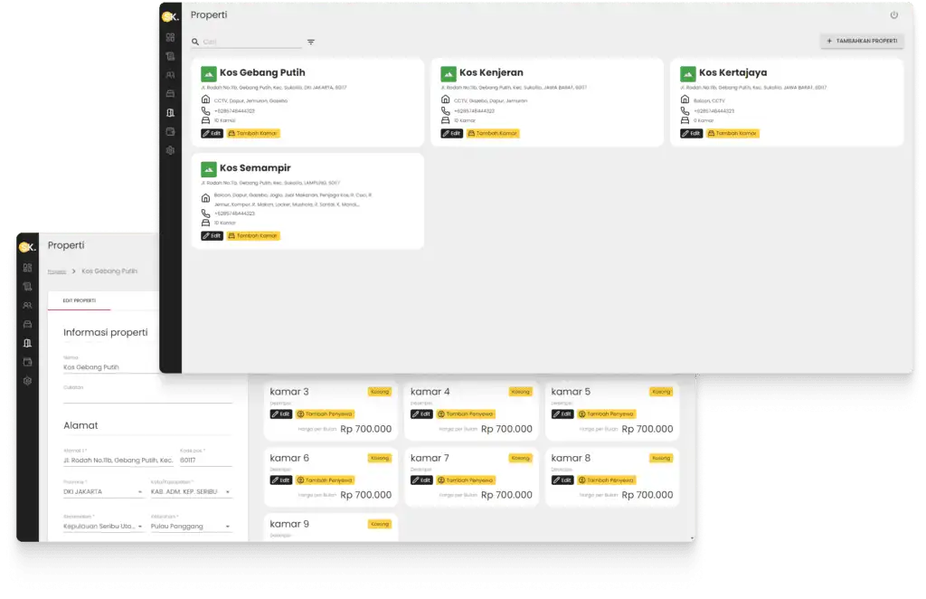 Pemilik kos bisa mengakses sistem melalui laptop atau smartphone, sehingga manajemen tetap bisa dilakukan di mana saja. -