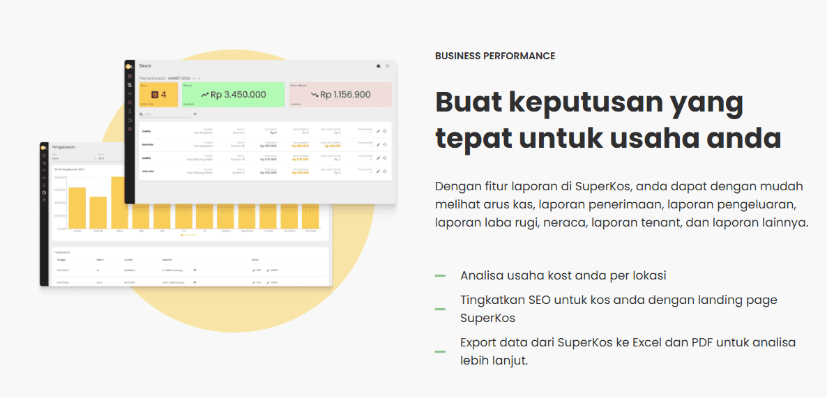 Semua pemasukan, tunggakan, hingga laporan bulanan tersaji dalam bentuk ringkas dan jelas. Cocok untuk pemilik kos yang ingin memantau performa bisnis dengan cepat. -