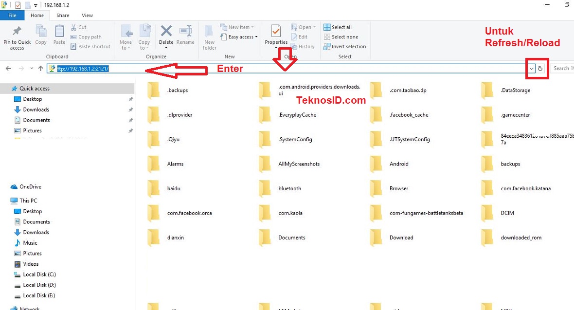 - Sekarang pada PC buka File Explorer, di address bar tulis alamat ip ftp seperti yang ada di aplikasi Mi Drop, contoh: ftp://192.168.1.2:2121, setelah itu klik Enter